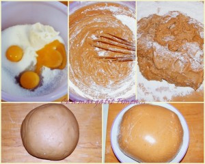 Intr-un bol amestecam galbenusurile cu 150 gr zahar, untura, condimentele si laptele in care am stins amoniacul. Adaugam siropul racit si apoi treptat incorporam faina. O sa simtiti cand framantati cam cata faina trebuie sa cuprinda (am vazut ca in reteta scria aprox 1 kg insa la mine a fost suficient 900 gr). Trebuie sa aveti un aluat legat usor de intins. Aluatul ramane usor lipicios din cauza siropului.