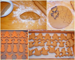 Pe rand intindem cate o foaie de aprox 5 mm grosime pe masa tapetata cu faina (aluatul devine usor lipicios insa nu am avut probleme sa il intind) si decupam formele dorite. Aluatul ramas dupa ce decupam il punem deoparte si impreuna cu resturile de la celelalte foi intinse il framantam din nou si il intindem apoi si decupam forme pana se gata aluatul.