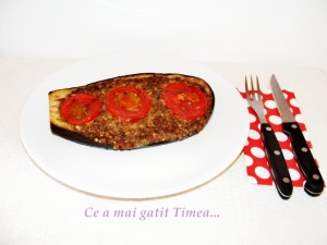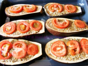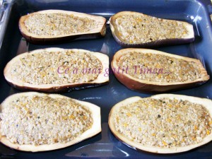 Umplem jumatatile de vinete cu compozitia rezultata si le asezam intr-o tava unsa cu putin ulei.